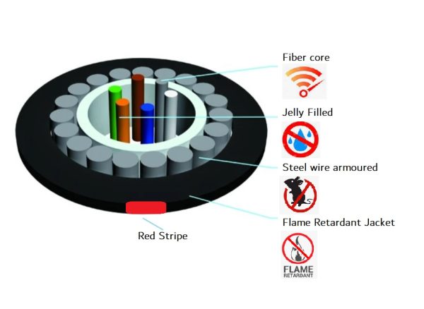 UniTube Fire Resistant Fibre Optic Cable Non Metallic Armoured Double Jacketed Red line with SWA